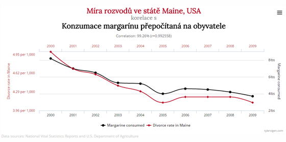 Článek na idnesu, který se statistickou manipulací zabývá podrobněji, vybral na odlehčení absurdní příklad. Porovnává trend rozvodů a konzumaci margarínů. Dvě věci, které spolu vůbec nesouvisí. Výsledek?